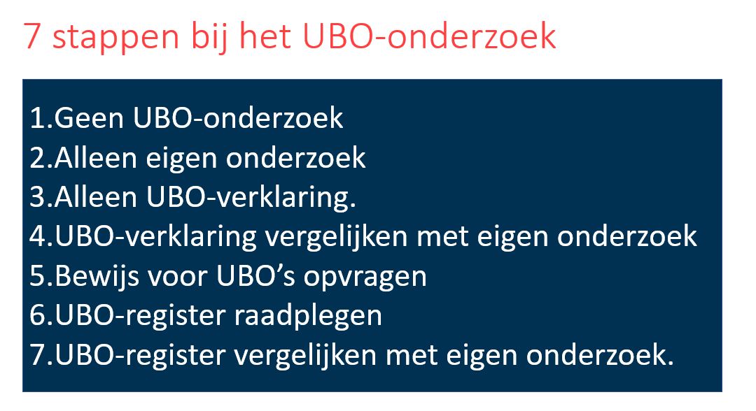 Vanuit de praktijk zien we 7 stappen van UBO-onderzoek bij Wwft-instellingen. Alleen als je alle 7 de stappen doorloopt, voldoe je aan de Wwft. De meeste organisaties doorlopen slechts enkele van deze 7 stappen. Dit werd in de zomer van 2022 ook geconstateerd door de FATF.