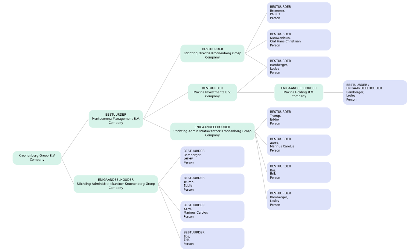 Hieronder staat een voorbeeld van vastgoedontwikkelaar Kroonenberg Groep B.V. Zij hebben Montecorona Management B.V. als bestuurder en de STAK Kroonenberg Groep als Enigaandeelhouder. Via deze enititeiten kan je verder zoeken totdat je uiteindelijk bij personen uitkomt.