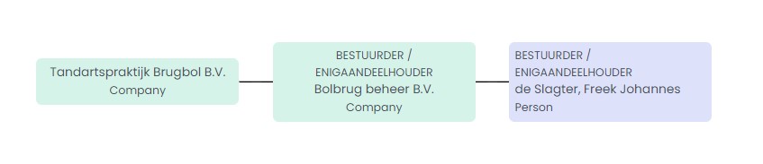 Brugbol B.V. heeft 1 bestuurder en een enigaandeelhouder. Dat is Bolbrug beheer B.V. En deze B.V. heeft ook weer 1 bestuurder en een enigaandeelhouder. Dat is Freek de Slagter. Freek is in ieder geval een UBO. Mogelijk neemt de vrouw van Freek alle zakelijke beslissingen en bepaalt zij wat er met het verdiende geld gebeurt. De vrouw van Freek is dan ook een UBO. De vrouw van Freek komt echter niet voor in openbare registers. Je kan hier achter komen via een UBO-verklaring.